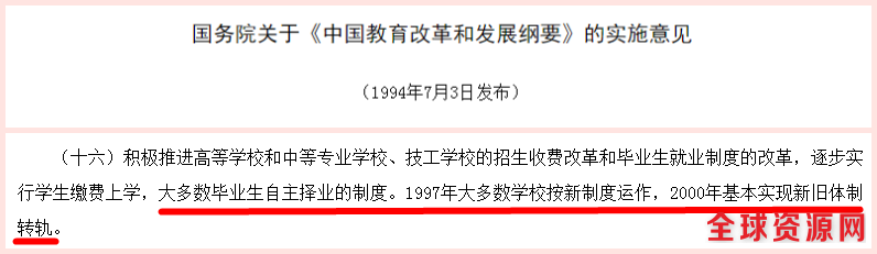 早在1994年7月3日,在伍继红入学前,国务院就下发《关于<中国教育改革和发展纲要>的实施意见》,开始砸破“铁饭碗”,并划定红线——逐步实行学生缴费上学,大多数毕业生自主择业的制度,1997年,大多数学校按新制度运作,2000年基本实现新旧体制转轨。