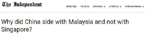 另一条,则来自23日的新加坡《独立报》:“为什么中国选择和马来西亚站在一起,而不是新加坡?”