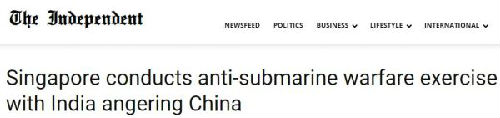 如果说将新马对华关系做比较会让一些新加坡人感到“不是滋味”,那么两天后,《独立报》另一篇有关中国的报道则更“扎眼”:“新加坡和印度联合举行的反潜演习惹怒中国”。