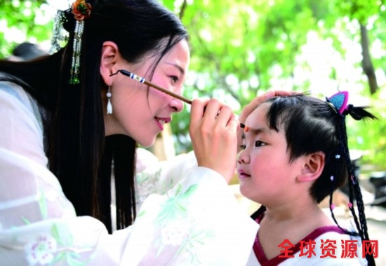 5月30日,广西柳州市城中区举行传统民俗主题活动,市民参与投壶、点雄黄、射五毒等活动,品味传统文化。图为在广西柳州市东门城楼前,工作人员为小朋友点雄黄。 新华/传真