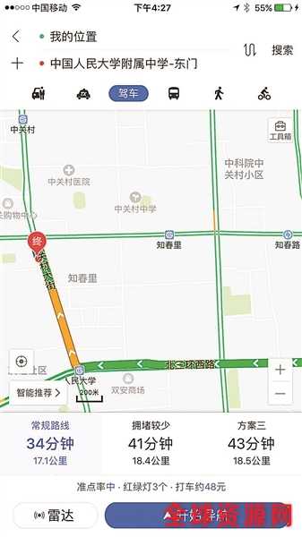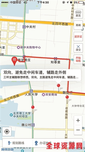 该软件还提供避让摄像头的行车导航服务,北青报记者尝试让软件导航从朝阳区团结湖公园到海淀区人大附中的路线,根据导航,车主由东向西行进到北三环联想桥时,应该向北右转进入中关村东路,如果像通常导航提示的到中关村大街才向北右转,则可能遇上位于联想桥西的一处进京证摄像头。