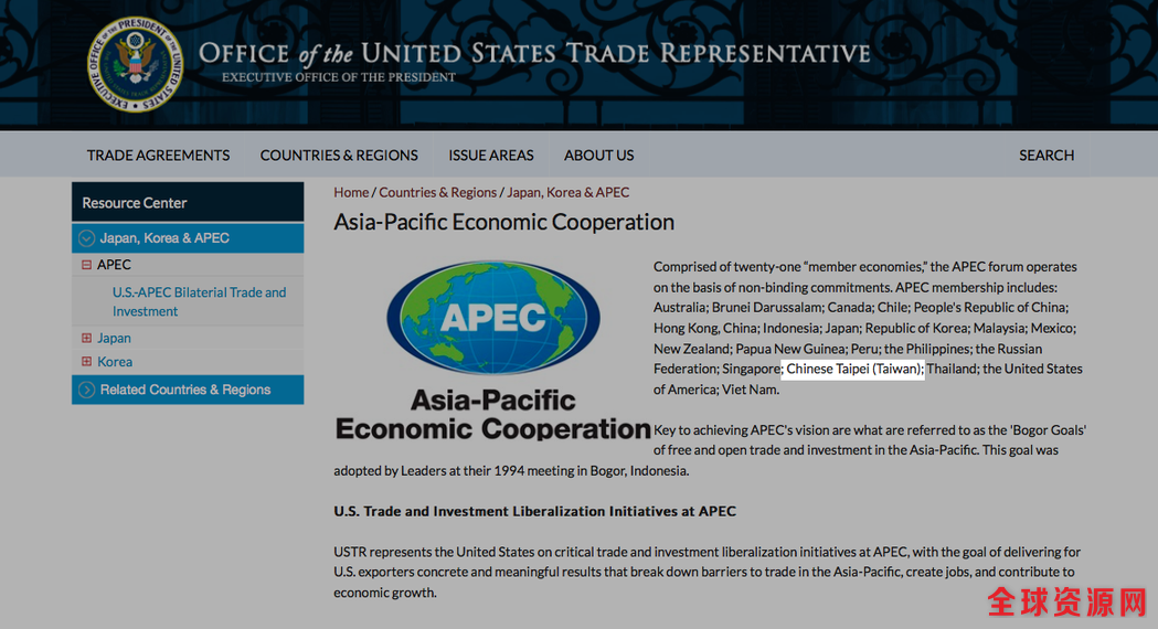 USTR网站上在介绍亚太经合组织(APEC)页面上,将“中华台北”写为“Chinese Taipei (Taiwan)”