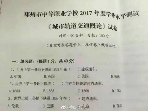 一张郑州市中等职业学校学业水平测试的试卷,连日来引发热议,这张试卷选择题的前三道依据同一句话——“世界第一条地下铁道1863年在英国伦敦建成通车”,区别只是抠了不同的关键词作为选择题的选项。试题公布到网上后立刻被冠上“雷人命题”的称呼。16日晚,北京青年报记者从郑州市教育局了解到,这张试卷是2017年郑州市职业学校(城轨专业)学业水平测试命题,涉及5所学校的2015、2016级城轨专业学生。相关负责人表示,出现这样的“雷人命题”是老师责任心不强、市职业技术教育教研室审核把关不严导致的,表示当地已着手对此问题进行调查,将对相关责任人进行处理。