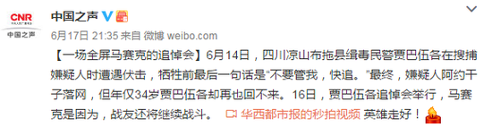 6月14日,四川凉山布拖县缉毒民警贾巴伍各在搜捕嫌疑人时遭遇伏击,牺牲前最后一句话是“不要管我,快追。”最终,嫌疑人阿约干子落网,但年仅34岁贾巴伍各却再也回不来。16日,贾巴伍各追悼会举行,马赛克是因为,战友还将继续战斗。
