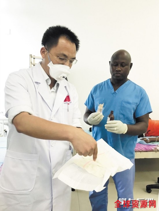 中国(湖南)第19批援塞拉利昂医疗队队员杨亮,正在指导塞方医护人员为患者实施导尿术。援塞医疗队供图