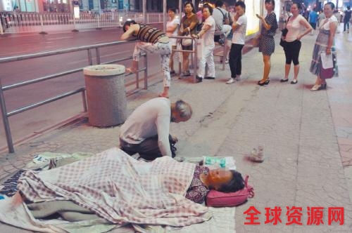一人跪地磕头,一人躺在一边装作痛苦状,这是用亲人重病的方式骗路人同情心,获得钱财。
