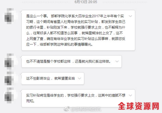 【网友求助:邯郸学院化学系强制收回省里已经给学生发放的补贴 合理吗?】邯郸学院化学系大四毕业生2017年上半年有个实习期,这个期间有省里人社局给学生的实习补贴,都发到学生自己的银行卡里,补贴刚发下来,学校就强行要求上交,也不解释为什么,往常好多人都不知道怎么回事 ,就稀里糊涂的上交了,这不上网查了查,确定有给毕业学生的实习补贴这么回事嘛,就跟您反应一下,给邯郸学院这种谋私的事情曝曝光。