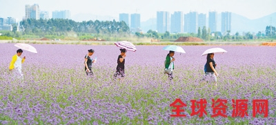 云南省罗平县以花为媒,以农促旅,在春天油菜花的基础上打造夏秋“多朵花”,有效弥补观光农业淡旺季分明的短板,不断为观光农业注入新元素。今年该县种植了数千亩葵花、马鞭草、鲁冰花、绣球花和一串红等,吸引大量游客前来观光旅游。图为游客在罗雄街道羊者窝村的马鞭草种植基地游玩。