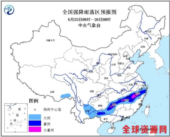 预计,6月25日08时至26日08时,湖南中部、江西中北部、福建西北部、浙江中南部、广西北部和西部、云南东部等地有大到暴雨,其中,广西北部、湖南西南部、江西中部和东北部、浙江西南部、福建西北部等地局地有大暴雨(100~220毫米)。上述部分地区有短时强降水、局地伴有雷暴大风等强对流天气,最大小时雨强30~60毫米,局地可超过80毫米。