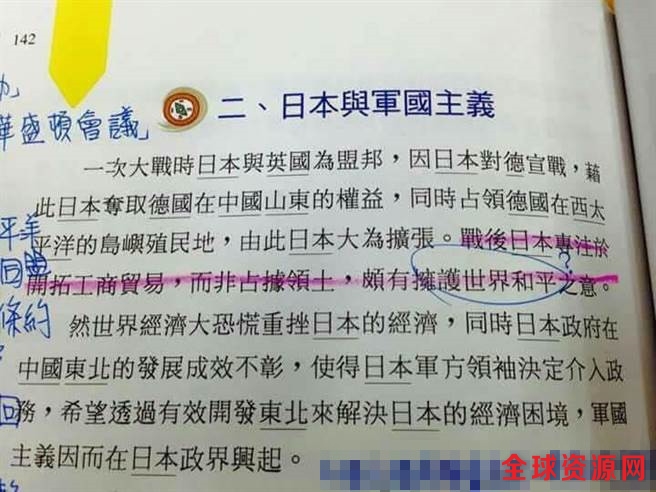 叶毓兰今(29日)在脸谱网(Facebook)转贴一张“白色正义联盟”照片,照片疑似是一张教科书截图。该截图章节为“日本与军国主义”,内文写道,一次大战后“日本专注于开拓工商贸易,而非占据领土,颇有拥护世界和平之意”。
