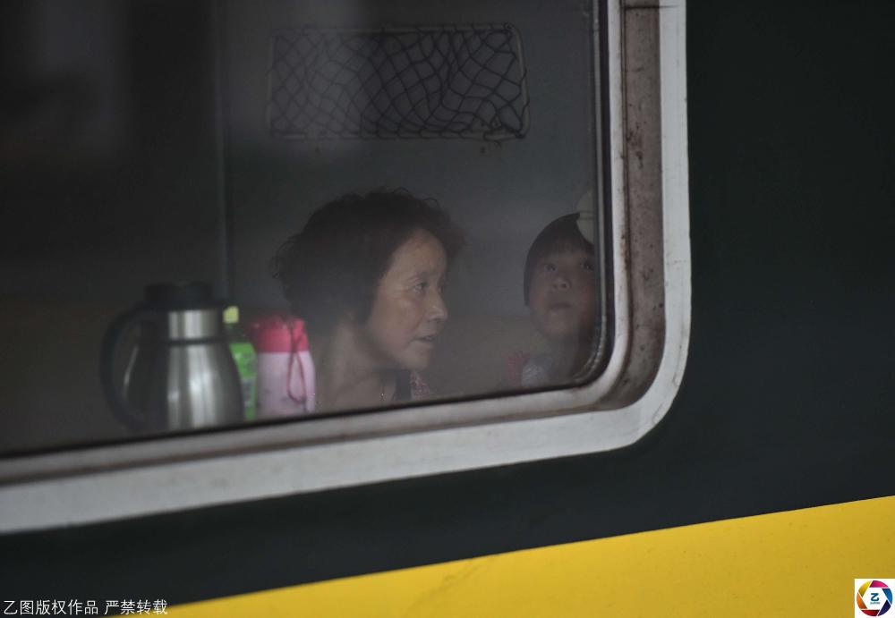当天下午5:15,蜂拥的人群涌向合肥至齐齐哈尔T242列车。靳先生和老伴带着外孙女,在女儿女婿的护送下,随着人流跑向列车。图为靳先生的女儿女婿和上车后的父母女儿告别。