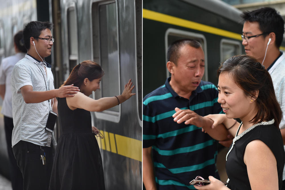 站台上,女儿女婿使劲地和车上的妈妈和女儿挥手。距离列车开动还有十几分钟,上车后的靳先生重新从车上走下来,在站台上和女儿女婿说着话,话语里更多的是嘱咐。图为靳先生突然落泪,女儿女婿在安慰。