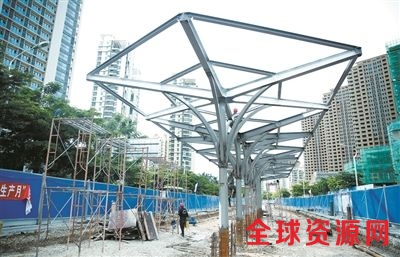记者在现场看到,工人正在对停靠站点的遮阳棚框架进行焊接,待有轨电车站台所有的内部基础设施铺设完成之后,市民游客就可以在这里换乘有轨电车。