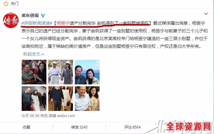 7月7日,一则关于“杨振宁遗产分割完毕,翁帆得到了一套别墅使用权”的消息在网上疯传,其称翁帆获得一座别墅的使用权,杨振宁与前妻子的三个儿子和一个女儿将获得现金资产。