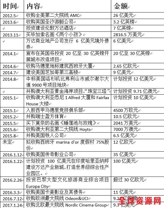 在国内“轻资产”的同时,万达在海外的投资不断加大。