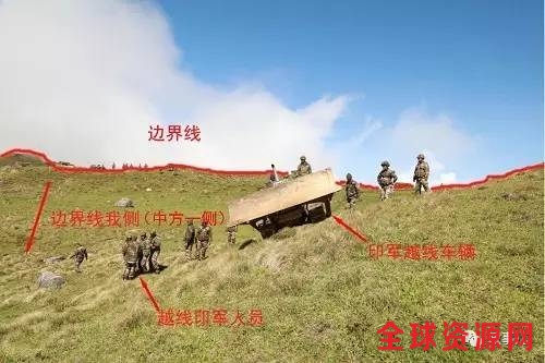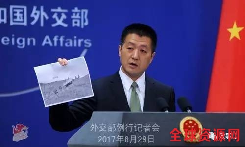 6月29日的记者会上,外交部发言人陆慷还出示了一张印度边防人员非法越过中印边界锡金段进入中国领土的有关照片。图中,印度士兵和车辆越过了作为边界线的分水岭,进入到中国境内。