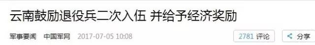 当外敌猖獗,祖国正面临威胁的时候,中国人民解放军退伍官兵们总是热切的盼望能够重返战场,为国效力!而近日,云南省出台了《2017征兵工作措施》其中提到的一条政策引起社会各界广泛讨论:《措施》提到,鼓励符合条件的退役人员二次入伍而且要给予一次性补偿。这一规定使得那些心怀军营的老兵又燃起了一腔热血。小编推荐一个订阅号:战略急先锋,每天精彩不断,爆料不断!