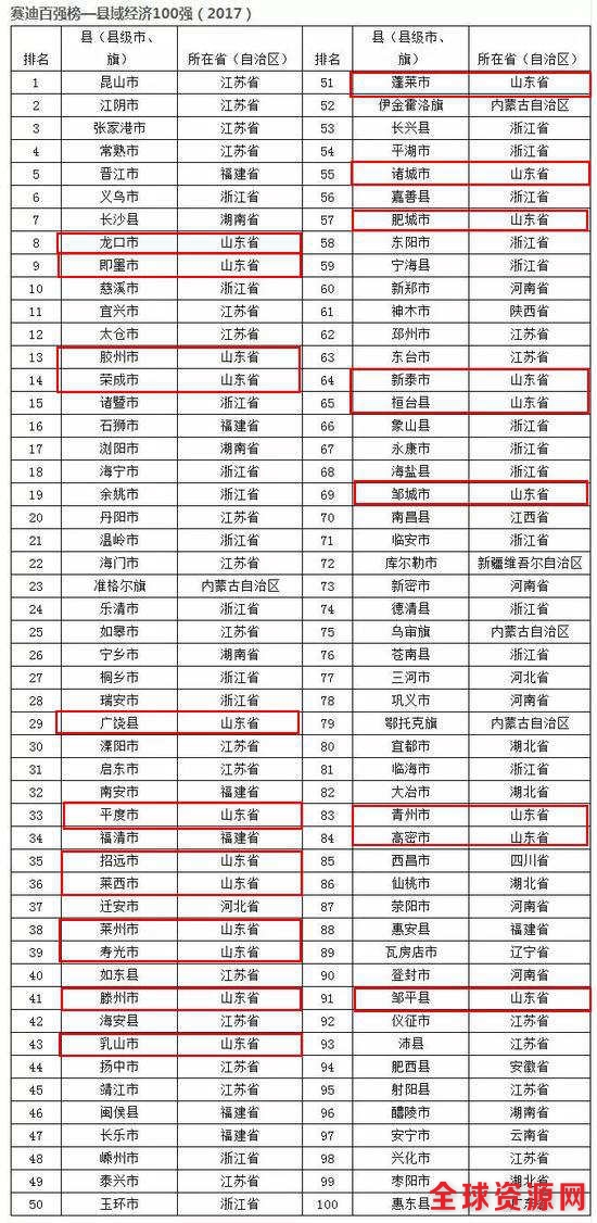 7月13日,工信部所属的赛迪智库发布了《2017年中国县域经济百强白皮书》和“赛迪百强榜-县域经济100强(2017)”。山东省共有21个县上榜,排名全国第三位。山东龙口、广饶、寿光、滕州等21县市上榜全国县域百强。其中龙口市和即墨市是山东在中国百强县排名最高的两个,分别为第8和第9位。