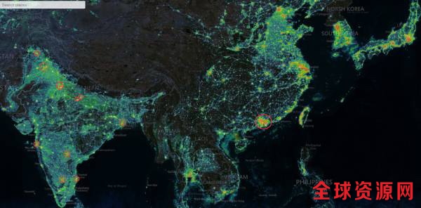 2016年中国的城镇化水平已经超过57%,而印度约为35%。村庄在灯光图上是点点的星光,所以整体看起来印度比较亮。而中国则是以大城市为中心的一个个大光点。比如下图~