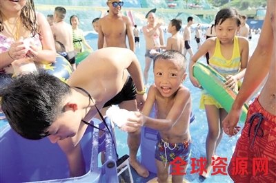 昨日,高温持续,数十位市民在洋人街水上乐园参加冰桶挑战活动,一解暑热。 本报记者 杨新宇 摄