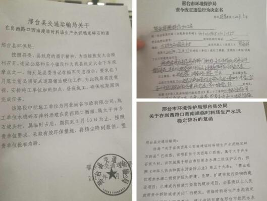 在邢台县环保分局207室。记者说明事由,几位环保局工作人员拿出一份立案违法行为决议书,和一份交通运输局关于临时建料场生产水泥稳定的函件。当记者再次要求查看一下处罚决定书时,该局工作人员告诉记者:”由于企业资金不足,处罚金额只交了一部分。截止记者离开时也没有看到处罚决定书以及交纳的罚金收据......