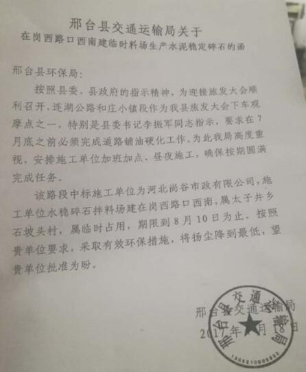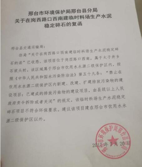 摘要:路段施工单位《河北尚谷市政有限公司》在邢台市饮用水二级水源地建起污染企业,邢台县交通局巧借县政府修路赶工期名义,为其向邢台县环保分局发函“求情“,被邢台县环保分局以不符合环保要求回复。