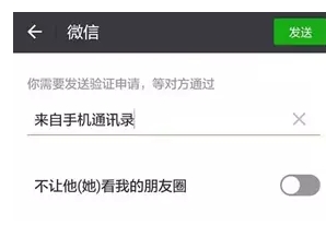 微信发送添加好友请求的时候,除非对方设定的是完全自动通过,否则需要验证。如果对方在验证信息中填写“来自手机通讯录”,对方微信姓名下面就显示“来自手机通讯录”。