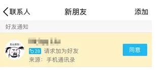 陌生人发出添加好友,点开通讯录,再点开“新的朋友”,出现好友添加请求列表,在人像姓名下直接显示:“来自通讯录好友”。