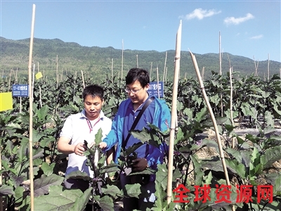 董鹏博士(右)在酉阳毛坝蔬菜基地茄子田间为农民做技术指导。 本报记者 苑铁力 摄