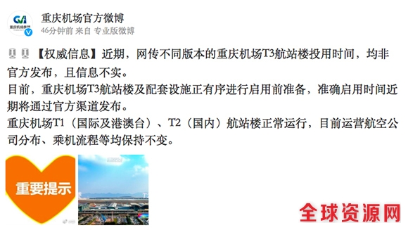 “@重庆机场官方微博”发布信息显示,近期,网传不同版本的重庆机场T3航站楼投用时间,均非官方发布,且信息不实。