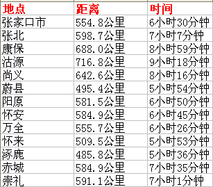 邢台至张家口各个县市距离