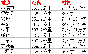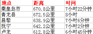 公里里程及自驾时间表