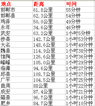 邢台市区到邯郸各县市距离