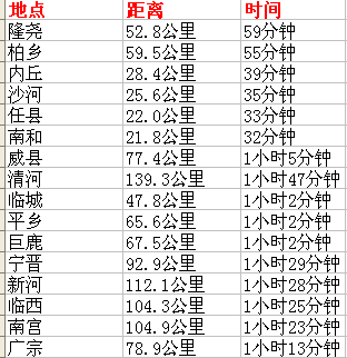 邢台市区到周边各县市距离
