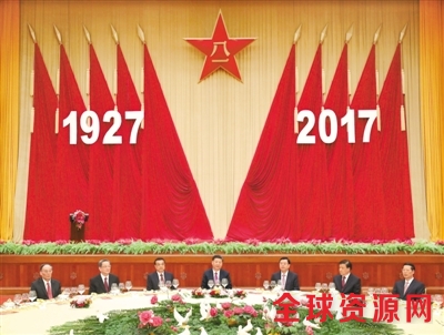 人民大会堂宴会厅灯火辉煌,洋溢着节日的喜庆气氛。主席台帷幕中央悬挂着巨型“八一”军徽,两旁是十面鲜艳的红旗。“1927—2017”几个醒目的大字,昭示着中国人民解放军走过了90年的光辉历程。18时许,在欢快的《迎宾曲》乐曲声中,习近平等党和国家领导人步入宴会大厅,同1800余名中外来宾欢聚一堂。