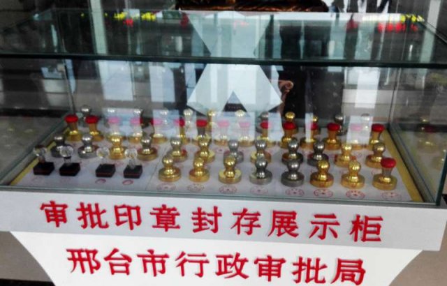 7 月 31 日邢台讯;在邢台市行政审批局大厅内,一个贴着封条的玻璃罩子内,4 排邢台市级各部门的审批专用章、共计 51 枚,这是河北省首例,涉及到大部分市级委、局等单位,也是邢台为了解决行政许可 " 公章四面围城、公函长途旅行 " 问题,而设立邢台市行政审批局后的一幕。