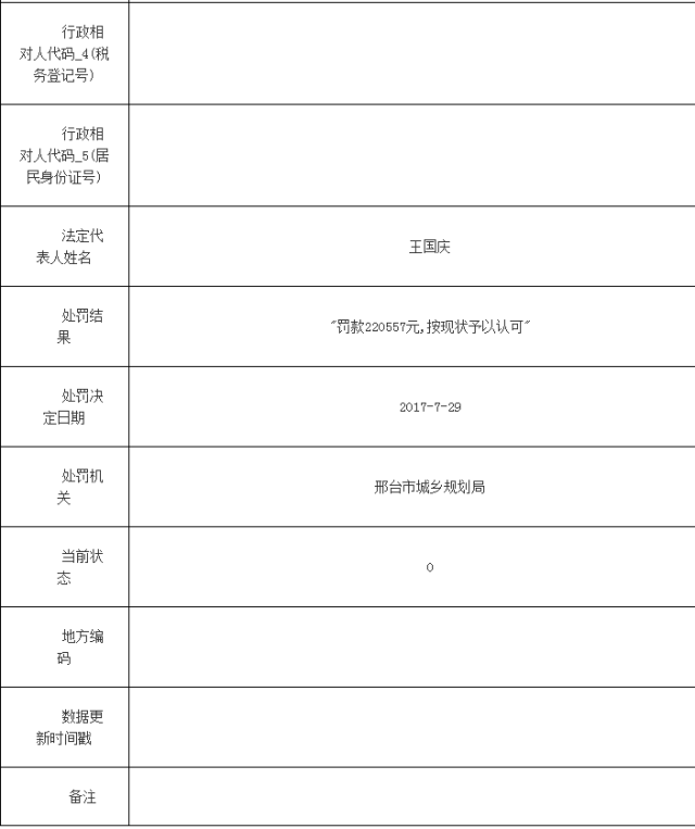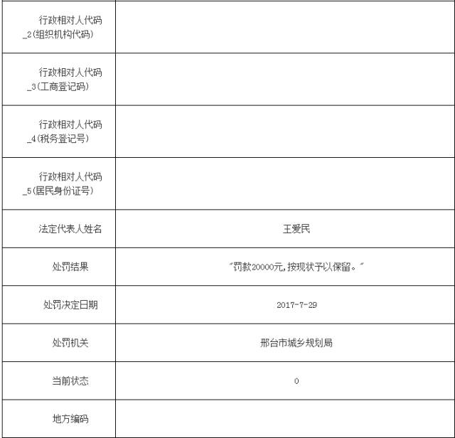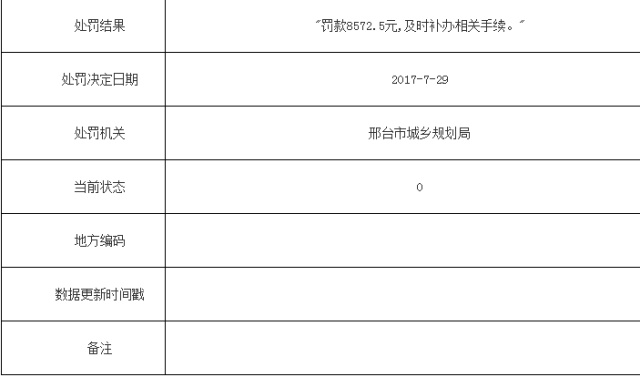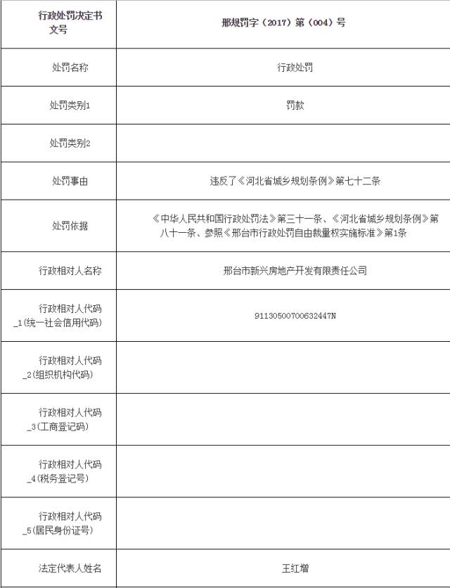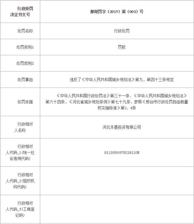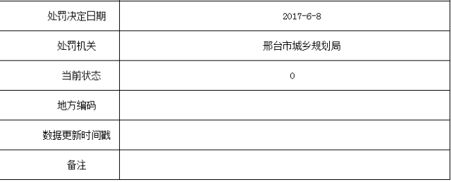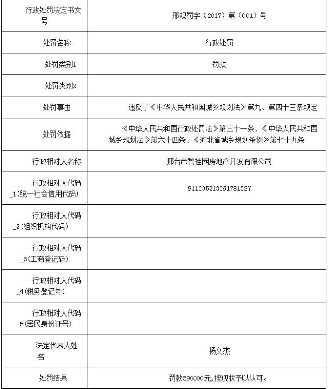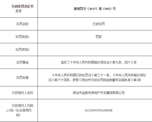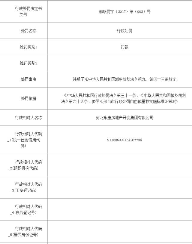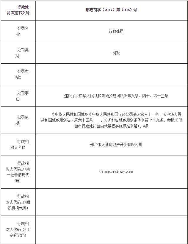 邢台市城乡规划局网站日前发布对邢台市碧桂园房地产开发有限公司、河北永康房地产开发集团有限公司、河北丰基投资有限公司、邢台市新兴房地产开发有限责任公司、邢台市大通房地产开发有限公司、邢台市金凯利房地产开发集团有限公司等6家房地产公司的行政处罚决定书。
