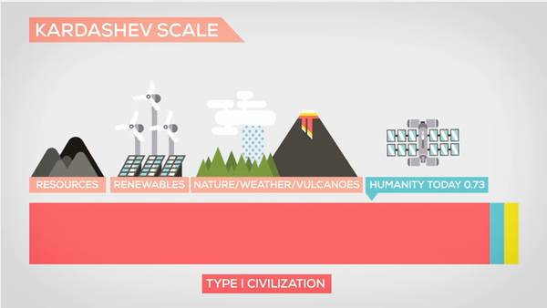 如果你想知道人类目前的状态的话,我们大约处在I型文明的73%左右。在接下来的几百年间,我们应该会达到I型的文明水准。