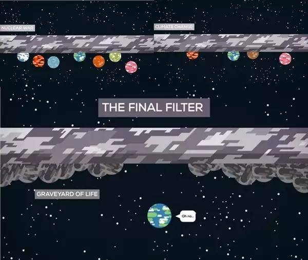 这一条就真的很可怕了,也许像我们这样水平的生命在宇宙中到处都有,不过到了一个特定的水平,相应的文明就被毁灭了,也许这个过滤器就在我们的前面。