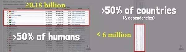 例如,大部分人类居住在有起码1.8亿人口的国家,但大部分国家只有少于600万的人口:
