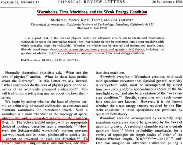 截图来自http://authors.library.caltech.edu/9262/1/MORprl88.pdf这篇名为 “Wormholes, Time Machines, and the Weak Energy Condition”的文章发表在物理学领域声望最高之一的杂志——Physical Review Letters上。