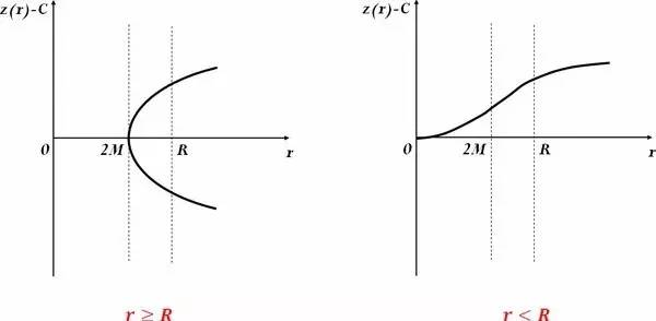 当然,因为知道在r<R是z(r)是一个单调递增函数,所以对这部分曲线做了一个简单的想象处理。上图左边的曲线,绕z轴旋转一圈,就是: