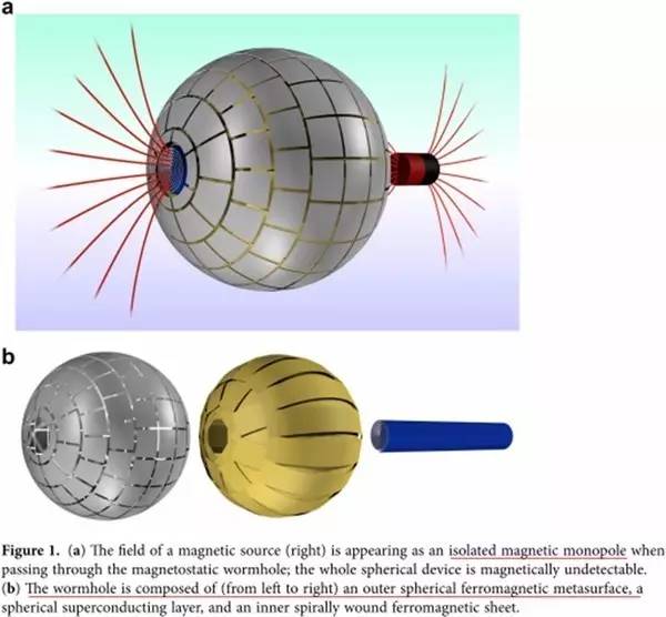 引自metamaterial 他们通过使用超材料,让磁场通过在通过隧道时没有留下痕迹。其实,在实验中的所谓“虫洞”,并不是“不可见的”,而是一个球体状的铁磁性超表面、球状的超导层以及内部的铁磁卷成的圆筒,另外实验的结果是磁场源以一个磁单子(单一磁极)孤立的出现隧道的另一头,好像就是凭空消失然后出现的状况,所以叫做磁场虫洞: