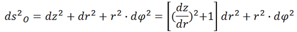 现在我们假设欧式空间中z-r面上有一个曲线表达式为z(r),根据3维欧式线元在柱坐标系{z, r, φ }的表达式为: