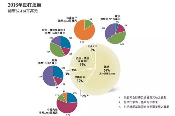 如果按EBIT(息税前利润)算,长和集团的欧洲化程度,严格地说是英国化程度就更高。2016年,集团59%的EBIT来自欧洲,英国占到36%,中国香港和中国内地加起来才15%,不到英国的一半。
