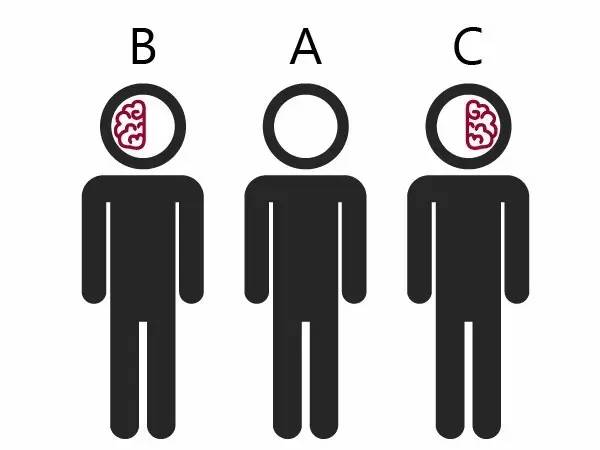 2. 拥有左半脑的B是A,拥有右半脑的C不是A
