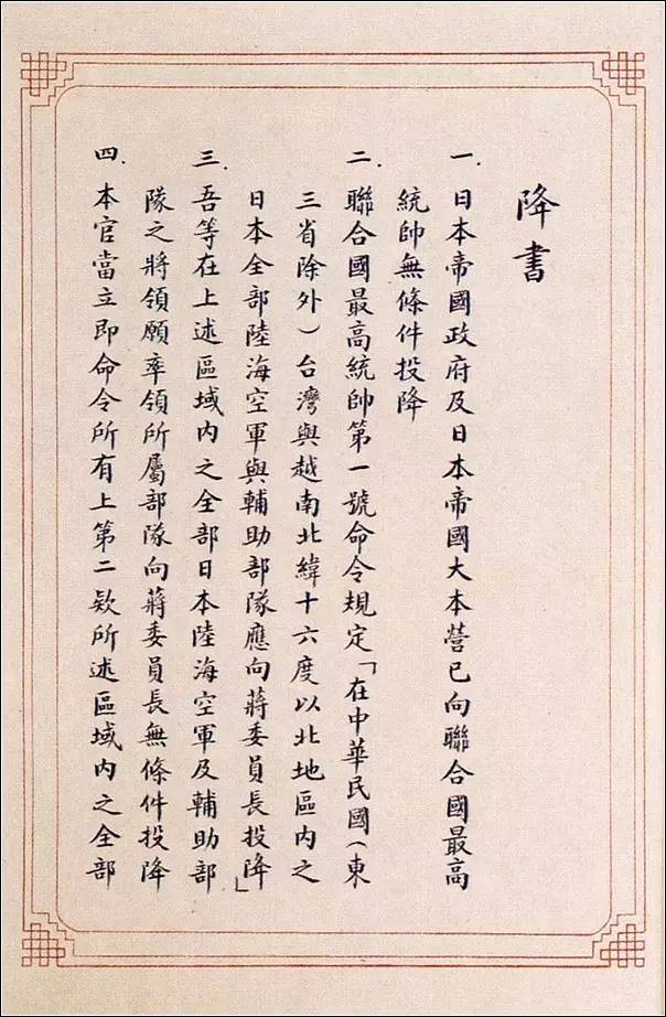 二、联合国最高统帅第一号命令规定在”中华民国(东三省除外)台湾与越南北纬十六度以北地区内之日本全部陆、海、空军与辅助部队应向蒋委员长投降”。