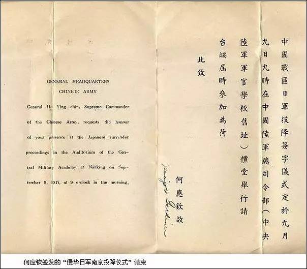 中国战区最高统帅特级上将蒋中正特派代表中国陆军总司令陆军一级上将 何应钦印