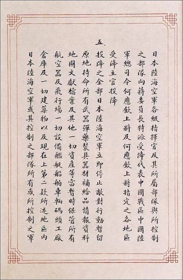 五、投降之全部日本陆、海、空军立即停止敌对行动,暂留原地待命,所有武器、弹药、装具、器材、〔第318页〕补给品、情报数据、地图、文献档案及其它一切资产等,当暂时保管。所有航空器及飞机场一切设备,舰艇、船舶、车辆、码头、工厂、仓库及一切建筑物,以及现在上第二款所述地区内日本陆、海、空军或其控制之部队所有或所控制之军用或民用财产,亦均保持完整,全部待缴於蒋委员长及其代表何应钦上将所指定之部队及政府机关代表接收。