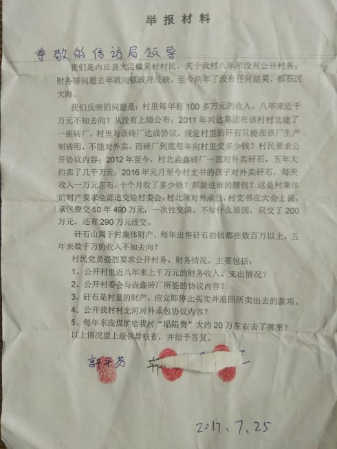快一年了,我们实名举报村务、财务不公开,上千万元收入不知去向?到镇政府反映问题已无数次,到县纪委举报十几次。镇政府把反映村里的问题推到县纪委,找县纪委时又把问题推到镇政府,“皮球”就这样踢来踢去,至今还是没有任何结果”,内丘县大孟镇吴村村干部郭平芬无奈的说。村干部郭平芬说,全村村民党员只要求公开近八年来的村务、财务支出情况,没想到阻力这么大,就连镇政府和县纪委都不敢查我们村财务,这在当地群众中造成了很坏的影响,看来只好向省里反映了。吴村村民告诉记者,村里每年有100多万元的收入,八年来近千万元不知去向?从没有上墙公布;2011年兴达集团在该村村北建了一座砖厂,村里与该砖厂达成协议,规定村里的矸石只能在该厂生产制砖用,不能对外卖。而砖厂到底每年向村里交多少钱?村民要求公开协议内容;2012年至今,村北垚鑫砖厂一直对外卖矸石,五年大约卖了几千万元;2016年元月至今村支书的孩子对外卖矸石,每天收入一万元左右,十个月收了多少钱?都装进谁的腰包?这是村集体的财产要求全部追交给村委会;村北河对外承包,村支书在大会上说,承包费交50年490万元,一次性交清。不知什么原因,只交了200万元,还有290万元没交。村干部郭平芬和村民党员强烈要求公开村务、财务情况,主要包括:1、公开村里近八年来上千万元的财务收入、支出情况?2、公开村委会与垚鑫砖厂所签的矸石山协议内容?3、矸石是村里的财产,应立即停止买卖并追回所卖出去的款项。4、公开村北河对外承包协议内容?最近,中央纪委有关负责人强调,民心是最大的政治。要落实中央纪委七次全会部署和要求,把管党治党的压力传导到县乡、责任落实到基层。各级纪检监察机关要聚焦扶贫领域,加大对“小官大贪”、侵吞挪用、克扣强占等侵害群众利益问题的查处力度,坚决整治“村霸”和宗族恶势力。问题典型、性质恶劣的,省、市纪委要直接调查处理。对问题长期得不到解决的要严肃追究责任,释放有责必问、问责必严的强烈信号。据了解,河北省委决定,今年4月至11月底,在全省开展“一问责八清理”专项行动和基层“微腐败”专项整治工作。,“一问责八清理”专项行动聚焦人民群众和市场主体反映强烈及巡视巡察、纪律审查和日常管理中发现的普遍性问题,着力解决党的领导弱化、主体责任缺失、落实政策不力、有章不循、懒政怠政等影响我省改革发展和党的建设的突出问题,确保中央和省重大决策部署贯彻落实。全面清理和纠正“不作为乱作为慢作为”问题,对不作为造成恶劣影响失职渎职的要严肃追责,绝不姑息。郭平芬说,“我们村为什么不敢向村民公开财务收支情况,是因为我们村有一座‘矸石山’对外一天能卖近万元矸石,八年来能卖多少钱?”那么,大孟镇吴村村干部郭平芬及村民强烈要求村务、财务公开,但大孟镇党委、政府至今不调查、不处理、不答复,快一年了,镇政府和县纪委互相推诿,到底谁在充当“保护伞”?希望省、市领导派人核查。